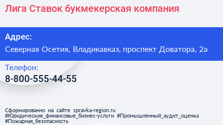 Лига Ставок, букмекерская компания по адресу Северная Осетия, Владикавказ, проспект Доватора, 2а в дальнейшем Организация, размещена в следующих категориях: