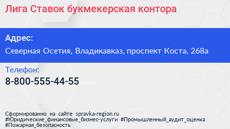 Лига Ставок, букмекерская контора по адресу Северная Осетия, Владикавказ, проспект Коста, 268а в дальнейшем Организация, размещена в следующих категориях: