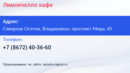 Лимончелло, кафе по адресу Северная Осетия, Владикавказ, проспект Мира, 45 в дальнейшем Организация, размещена в следующих категориях: