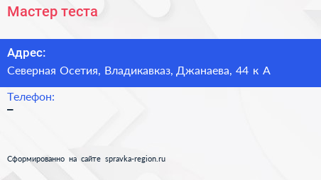 Мастер теста по адресу Северная Осетия, Владикавказ, Джанаева, 44 к А в дальнейшем Организация, размещена в следующих категориях: