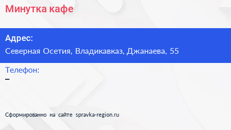 Минутка, кафе по адресу Северная Осетия, Владикавказ, Джанаева, 55 в дальнейшем Организация, размещена в следующих категориях: