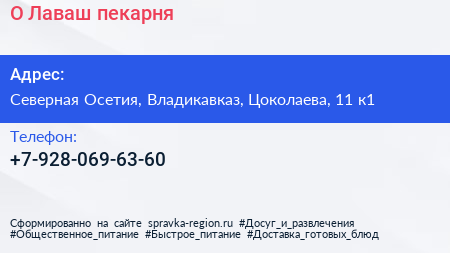 О! Лаваш, пекарня по адресу Северная Осетия, Владикавказ, Цоколаева, 11 к1 в дальнейшем Организация, размещена в следующих категориях: