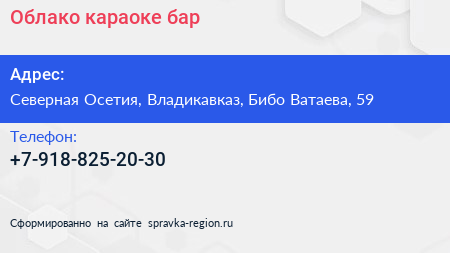 Облако, караоке-бар по адресу Северная Осетия, Владикавказ, Бибо Ватаева, 59 в дальнейшем Организация, размещена в следующих категориях: