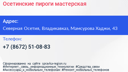 Осетинские пироги, мастерская по адресу Северная Осетия, Владикавказ, Мамсурова Хаджи, 43 в дальнейшем Организация, размещена в следующих категориях: