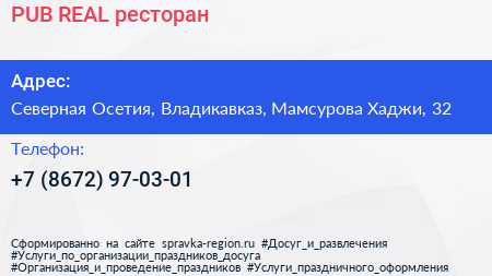 PUB REAL, ресторан по адресу Северная Осетия, Владикавказ, Мамсурова Хаджи, 32 в дальнейшем Организация, размещена в следующих категориях: