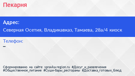 Пекарня по адресу Северная Осетия, Владикавказ, Тамаева, 28а/4 киоск в дальнейшем Организация, размещена в следующих категориях: