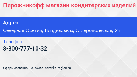 Пирожникофф, магазин кондитерских изделий по адресу Северная Осетия, Владикавказ, Ставропольская, 2Б в дальнейшем Организация, размещена в следующих категориях: