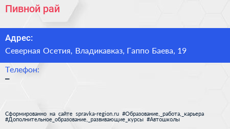 Пивной рай по адресу Северная Осетия, Владикавказ, Гаппо Баева, 19 в дальнейшем Организация, размещена в следующих категориях:
