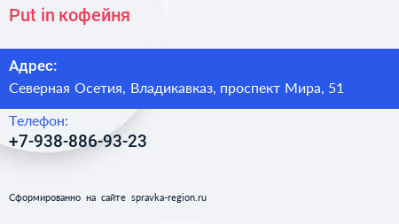 Put in, кофейня по адресу Северная Осетия, Владикавказ, проспект Мира, 51 в дальнейшем Организация, размещена в следующих категориях: