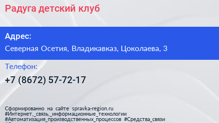 Радуга, детский клуб по адресу Северная Осетия, Владикавказ, Цоколаева, 3 в дальнейшем Организация, размещена в следующих категориях: