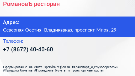 РомановЪ, ресторан по адресу Северная Осетия, Владикавказ, проспект Мира, 29 в дальнейшем Организация, размещена в следующих категориях: