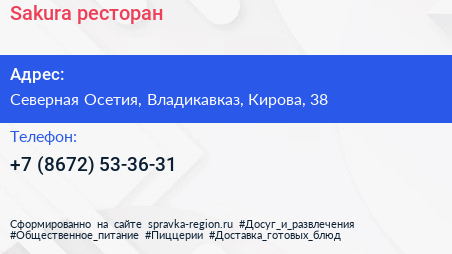 Sakura, ресторан по адресу Северная Осетия, Владикавказ, Кирова, 38 в дальнейшем Организация, размещена в следующих категориях: