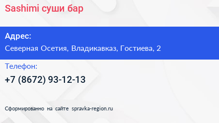 Sashimi, суши-бар по адресу Северная Осетия, Владикавказ, Гостиева, 2 в дальнейшем Организация, размещена в следующих категориях: