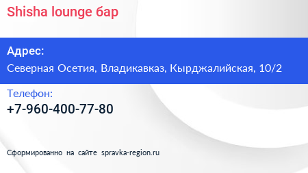 Shisha lounge, бар по адресу Северная Осетия, Владикавказ, Кырджалийская, 10/2 в дальнейшем Организация, размещена в следующих категориях: