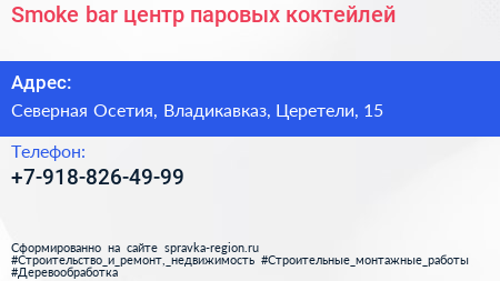 Smoke bar, центр паровых коктейлей по адресу Северная Осетия, Владикавказ, Церетели, 15 в дальнейшем Организация, размещена в следующих категориях: