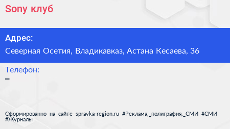 Sony, клуб по адресу Северная Осетия, Владикавказ, Астана Кесаева, 36 в дальнейшем Организация, размещена в следующих категориях: