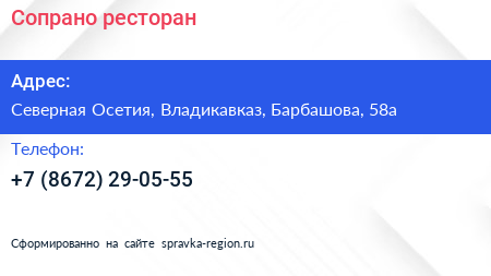 Сопрано, ресторан по адресу Северная Осетия, Владикавказ, Барбашова, 58а в дальнейшем Организация, размещена в следующих категориях: