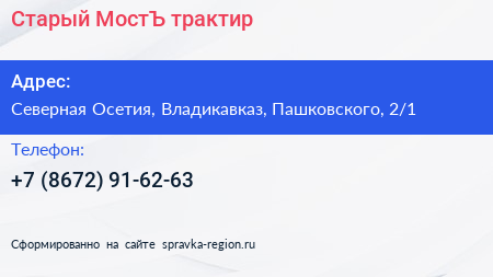 Старый МостЪ, трактир по адресу Северная Осетия, Владикавказ, Пашковского, 2/1 в дальнейшем Организация, размещена в следующих категориях: