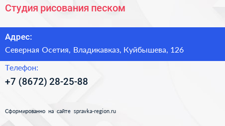 Студия рисования песком по адресу Северная Осетия, Владикавказ, Куйбышева, 126 в дальнейшем Организация, размещена в следующих категориях: