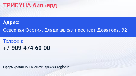 ТРИБУНА, бильярд по адресу Северная Осетия, Владикавказ, проспект Доватора, 92 в дальнейшем Организация, размещена в следующих категориях: