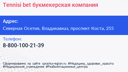 Tennisi bet, букмекерская компания по адресу Северная Осетия, Владикавказ, проспект Коста, 255 в дальнейшем Организация, размещена в следующих категориях: