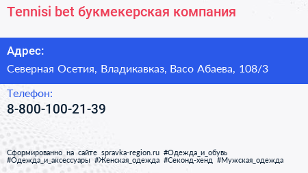 Tennisi bet, букмекерская компания по адресу Северная Осетия, Владикавказ, Васо Абаева, 108/3 в дальнейшем Организация, размещена в следующих категориях: