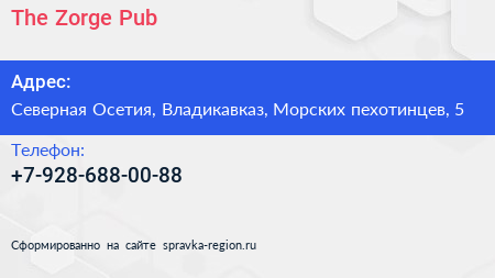 The Zorge Pub по адресу Северная Осетия, Владикавказ, Морских пехотинцев, 5 в дальнейшем Организация, размещена в следующих категориях: