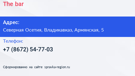 The bar по адресу Северная Осетия, Владикавказ, Армянская, 5 в дальнейшем Организация, размещена в следующих категориях: