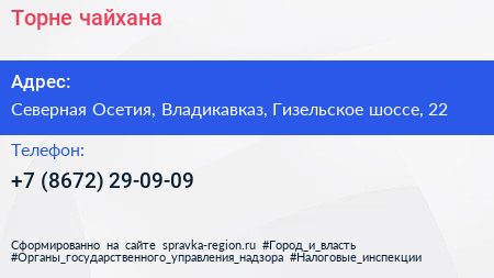 Торне, чайхана по адресу Северная Осетия, Владикавказ, Гизельское шоссе, 22 в дальнейшем Организация, размещена в следующих категориях: