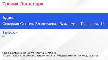 Тропик-Лэнд, парк по адресу Северная Осетия, Владикавказ, Владимира Тхапсаева, 16а в дальнейшем Организация, размещена в следующих категориях: