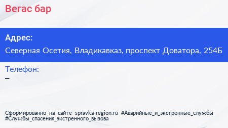 Вегас, бар по адресу Северная Осетия, Владикавказ, проспект Доватора, 254Б в дальнейшем Организация, размещена в следующих категориях: