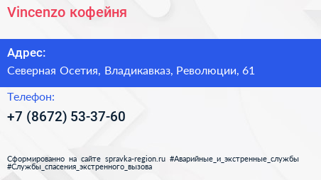 Vincenzo, кофейня по адресу Северная Осетия, Владикавказ, Революции, 61 в дальнейшем Организация, размещена в следующих категориях: