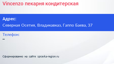 Vincenzo, пекарня-кондитерская по адресу Северная Осетия, Владикавказ, Гаппо Баева, 37 в дальнейшем Организация, размещена в следующих категориях: