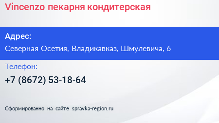 Vincenzo, пекарня-кондитерская по адресу Северная Осетия, Владикавказ, Шмулевича, 6 в дальнейшем Организация, размещена в следующих категориях: