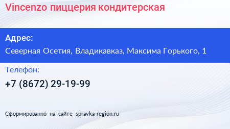 Vincenzo, пиццерия-кондитерская по адресу Северная Осетия, Владикавказ, Максима Горького, 1 в дальнейшем Организация, размещена в следующих категориях: