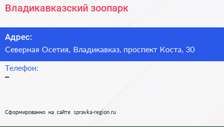 Владикавказский зоопарк по адресу Северная Осетия, Владикавказ, проспект Коста, 30 в дальнейшем Организация, размещена в следующих категориях: