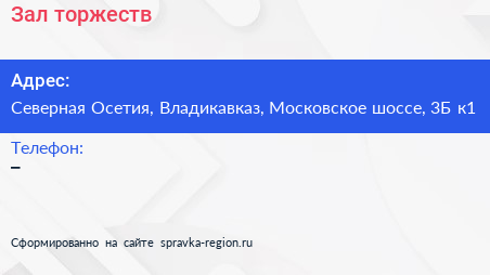 Зал торжеств по адресу Северная Осетия, Владикавказ, Московское шоссе, 3Б к1 в дальнейшем Организация, размещена в следующих категориях: