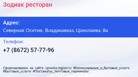 Зодиак, ресторан по адресу Северная Осетия, Владикавказ, Цоколаева, 8а в дальнейшем Организация, размещена в следующих категориях: