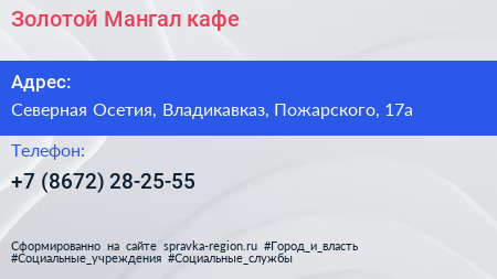 Золотой Мангал, кафе по адресу Северная Осетия, Владикавказ, Пожарского, 17а в дальнейшем Организация, размещена в следующих категориях: