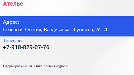 Ателье по адресу Северная Осетия, Владикавказ, Гугкаева, 26 к1 в дальнейшем Организация, размещена в следующих категориях: