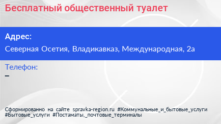 Бесплатный общественный туалет по адресу Северная Осетия, Владикавказ, Международная, 2а в дальнейшем Организация, размещена в следующих категориях:
