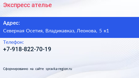 Экспресс-ателье по адресу Северная Осетия, Владикавказ, Леонова, 5 к1 в дальнейшем Организация, размещена в следующих категориях: