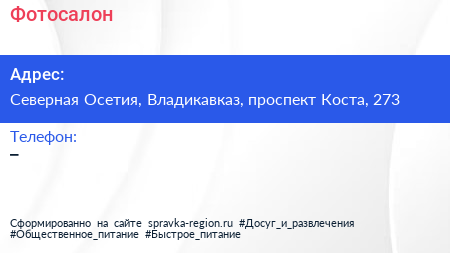 Фотосалон по адресу Северная Осетия, Владикавказ, проспект Коста, 273 в дальнейшем Организация, размещена в следующих категориях: