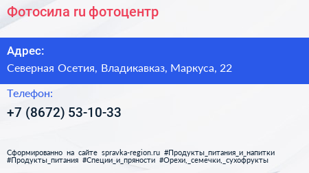 Фотосила.ru, фотоцентр по адресу Северная Осетия, Владикавказ, Маркуса, 22 в дальнейшем Организация, размещена в следующих категориях: