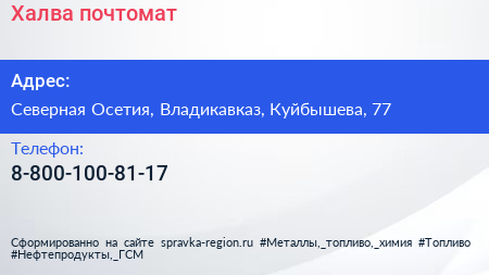 Халва, почтомат по адресу Северная Осетия, Владикавказ, Куйбышева, 77 в дальнейшем Организация, размещена в следующих категориях: