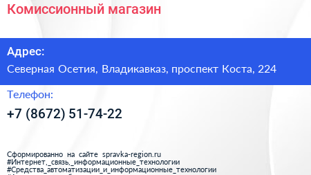 Комиссионный магазин по адресу Северная Осетия, Владикавказ, проспект Коста, 224 в дальнейшем Организация, размещена в следующих категориях: