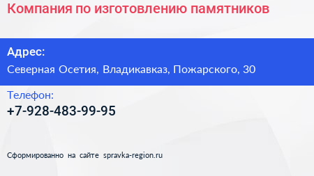 Компания по изготовлению памятников по адресу Северная Осетия, Владикавказ, Пожарского, 30 в дальнейшем Организация, размещена в следующих категориях:
