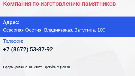 Компания по изготовлению памятников по адресу Северная Осетия, Владикавказ, Ватутина, 100 в дальнейшем Организация, размещена в следующих категориях: