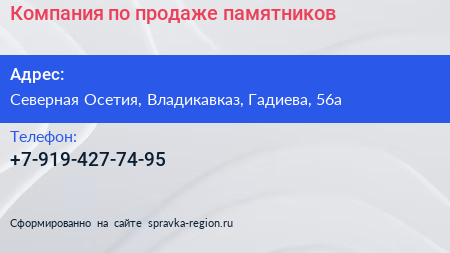 Компания по продаже памятников по адресу Северная Осетия, Владикавказ, Гадиева, 56а в дальнейшем Организация, размещена в следующих категориях: