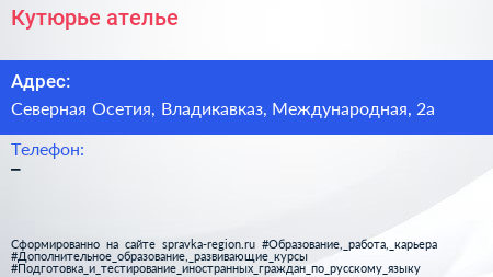 Кутюрье, ателье по адресу Северная Осетия, Владикавказ, Международная, 2а в дальнейшем Организация, размещена в следующих категориях: